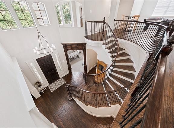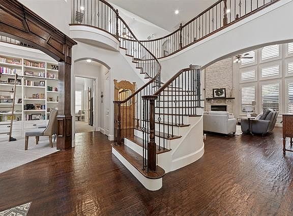 You are greeted by a gorgeous winding staircase with catwalk & soaring ceilings! Updated 5 BR 4 bath w 2 studies + game & media. Open plan w 2 BRs down & 3 up. Handscraped wood floors both up & down w new carpet in BRs. Living room w stunning 2 story stone fireplace. Updated kitchen-tons of cabinets, marble backsplash, granite, island, wrap-around bfast bar, & butler pantry w coffee bar. Updated lighting & freshly painted. Study has custom built-ins w library ladder & loft 2nd study. Tons of storage thru-out. Walk-in attic. 3 car garage & shed, 3 HVACs replaced. New roof, water heaters & fence. Just steps away to greenbelt, trails, pool, tennis, parks, Boone Elem, Starbucks & Sprouts. Easy access to 75 & 121.