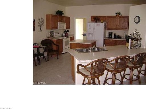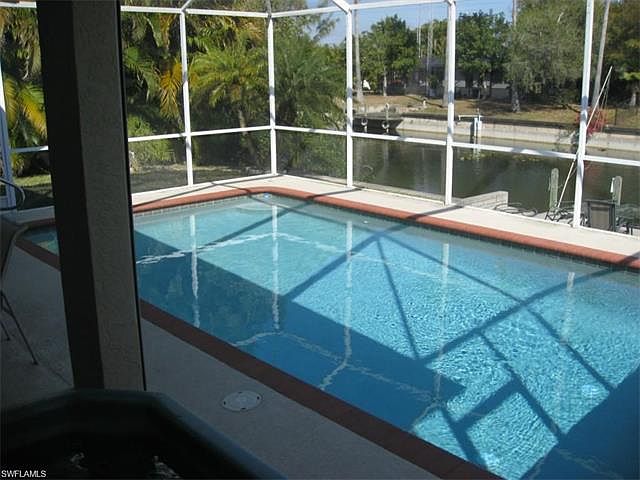 Beautiful large home in great SW Cape area. Freshwater POOL home with solar heat. Over 2,000 square feet, built in 2002 and recently remodeled! Looking for a Huge kitchen? This kitchen features oak cabinets with a center island and peninsula seating! Separate dining area, living room with this open floor plan, tile throughout, carpet in bedrooms, additional room for a home office. Huge utility room and pantry for extra storage. You can fish and cruise miles of freshwater canals including Lake Kennedy and Alhambra Lake from your own dock. This home also a newer spa, huge lanai, electric roll down shutters, front door and garage door screens. Pets with approval and pet deposit.