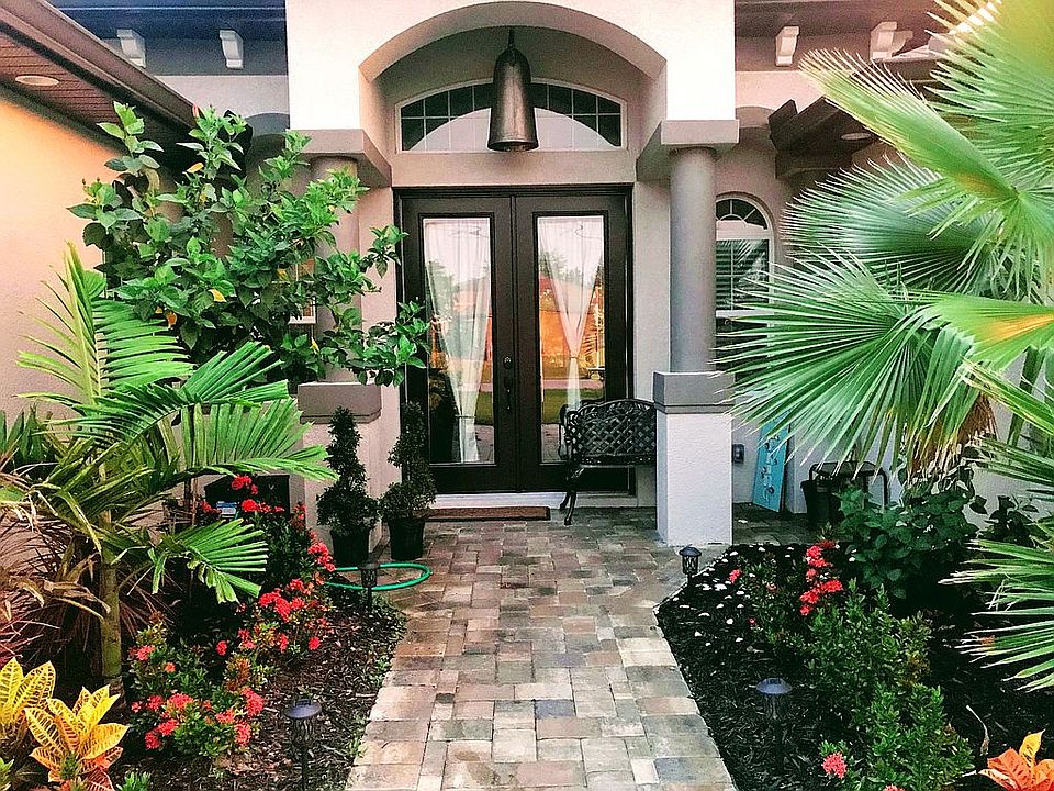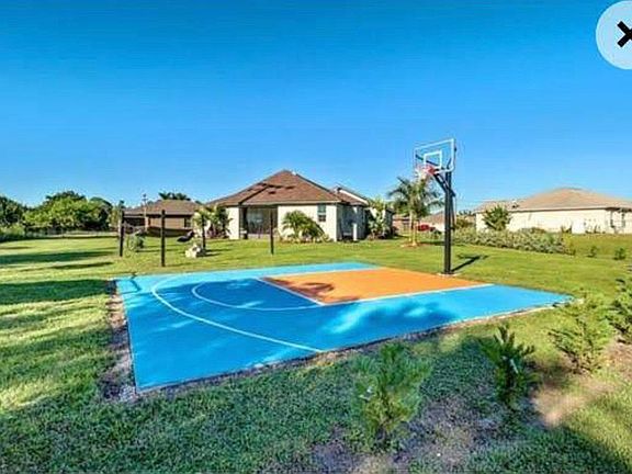 Click the Virtual Tour Link to view an interactive VIRTUAL WALK THROUGH and ADDITIONAL PICTURES of this house -No need to wait on a new build - This comparable to new custom home has everything your family is looking for... with 3-bedrooms,+ den, the open great room floor plan features 11' trayed ceilings with accent lighting, a huge walk-in pantry, corner sliders that open to an over-sized pavered lanai. The owner's suite features a sitting room area, plus an elegant modern bath with center spa tub and walk-through shower. Additional benefits include an over-sized garage, basketball court, and impact glass windows. All this on an almost 1/2-acre lot in walking distance to the Cape Coral Sports Center and Trafalgar Middle School. "Some photos in this advertisement depict virtually staged spaces."