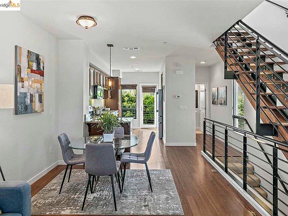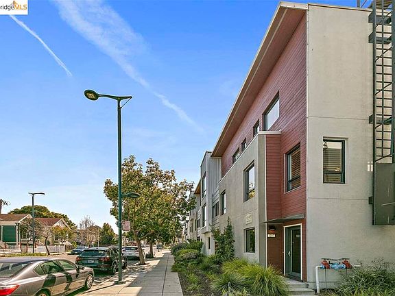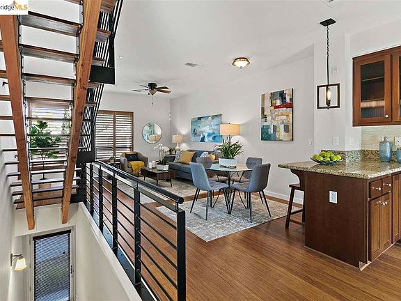 Rare, coveted corner unit w/ 3 walls of windows and just 1 shared wall, boasting serene views of the Oakland hills on one side, lush garden views from the other. Tri-level townhome w/ a chic vibe, smart layout & an open concept, all in the heart of vibrant West Oakland. Lovely bamboo wood floors flow through the main level w/ soaring ceilings & impressive wood beamed steel framed staircase w/ open treads. Beautiful kitchen has granite counters, under cabinet lighting, large pantry, newer appliances, & breakfast bar with stylish Edison pendant light. A glass door leads to a private deck overlooking the gorgeous common garden space. Half bath present on main level. Two bedrooms, two full baths on the upper level w/ ample closets & nice separation of space. Large garage w/ interior access offers extra space for a home gym plus the area near a window is perfect for a work-from-home lifestyle. Custom plantation shutters & rustic wall sconces are unique upgrades. Ultra-convenient location.