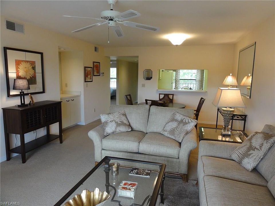 Enjoy the Kelly Greens experience. Open the door to this beautifully decorated, move in ready, 2 bed, 2 bath, immaculate second floor Terrace with a fantastic view of the golf course and lakes. This freshly painted unit features many new updates including newer furniture throughout, carpeting, 2 TVs, A/C, range, microwave and window treatments. This unit is centrally located near the tennis courts, golf practice range and the clubhouse/restaurant. Enjoy the view of the pristine KG golf course and lakes from your lanai. Steps to the community pool. Kelly Greens is a fiscally sound, meticulously maintained, bundled golf and tennis country club community that includes a Gordon Lewis Champion golf course, four Har-Tru tennis courts and many other amenities. Located minutes from Sanibel and Fort Myers beaches, shopping, hospital and more. Schedule your showing today! SELLER WILL PAY THE $3,088 GOLF COURSE RENOVATION ASSESMENT