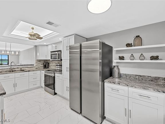 Welcome to Your Florida Paradise at Kelly Greens Golf & Country Club! Embrace the luxury lifestyle in this prestigious private golf course community. This beautifully remodeled, first-floor, 2-bedroom, 2-bath end unit offers a modern design featuring numerous windows, recessed lighting, sleek granite countertops, real wood cabinetry, stainless steel appliances, and elegant porcelain flooring. A stunning bar just off the kitchen makes this home perfect for entertaining guests, family, and friends. Additionally, there is a wine/coffee bar with beverage cooler and more cabinetry for storage just off the bar area which is a must-see. The exterior of the home offers deeded parking under a carport just feet from your front door. The owner’s suite boasts a spacious bedroom with direct access to the screened patio, a large walk-in closet, and a beautifully designed bathroom with a stunning tile shower, seamless glass doors, and a large vanity with granite countertops and wood cabinetry. Wake up and enjoy relaxing on your private patio where you can enjoy absolutely stunning sunrises along with serene views of the golf course, tennis courts, and well-manicured lawn with lush landscaping. It's truly the perfect space for your morning coffee or relaxing evenings. The back patio also offers roll down shutters around the screens and a large storage closet. The 2nd bathroom was also updated with tile, granite and wood cabinetry. You can also sit back and enjoy the convenience of having indoor laundry and storage closet in your home. Located just minutes from Florida’s world-renowned beaches of Fort Myers Beach, Captiva, and Sanibel Island, with a variety of shopping and dining options nearby, this home offers the perfect blend of luxury and convenience. As part of this vibrant, pet-friendly community, enjoy exceptional amenities such as golf, tennis, pickleball, a fitness center, and a newly updated clubhouse with a community pool/spa and numerous activities to enjoy. There’s never a dull moment! Don’t miss this opportunity to make this your new home sweet home. Schedule a showing today and discover the best of living in Southwest Florida!