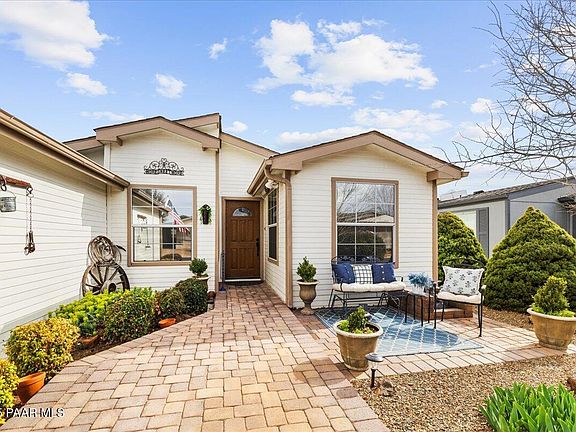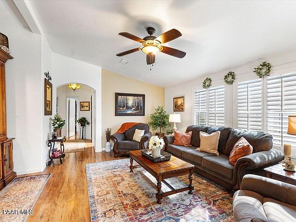 This charming and exceptionally well-maintained modular home is located in the sought-after 55+ community of The Villages at Lynx Creek. As you enter, you'll be struck by the high-quality finishes. Vaulted ceilings throughout add a sense of spaciousness, while plantation shutters and wood laminate floors create an atmosphere of warmth and sophistication. The kitchen has been tastefully upgraded with high-end cabinetry, solid surface countertops, a tile backsplash, and stainless steel appliances. The adjacent breakfast nook is ideal for casual meals, while the formal dining area provides plenty of space to host friends and family. The spacious primary suite features a walk-in closet with built-in organizers and a well-appointed ensuite bathroom with a walk-in shower and dual vanities.