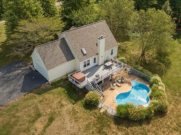 If you want a million-dollar view without the price, now is your opportunity to own it. First time offered in 27 years, with some of the most amazing views of the mountains and sunsets, on 9.37 acres. Custom built cape cod with great room concept. Lovely open great room with stone fireplace, cathedral ceilings, sky lights, new engineered hardwood floors and large eat in space. Upgraded kitchen with beautiful granite, stainless appliances, and cozy bow window. Two bedrooms, full bath and laundry, all on main level. Upper level offers primary bedroom and attached full bath with soaking tub, separate shower, and double sinks. A perfect loft/office area that overlooks the great room. Lower walk out level provides a fourth bedroom, full bath and super family room with custom stone area with woodstove. A gorgeous in-ground pool with large patio, paver walls. flower beds and fence is perfect for the makings of many happy memories with family and friends. Newer custom fire pit area perfect for entertaining on the cool fall/winter nights to come. Rear Trex deck offers the picture-perfect view of the sunsets while soaking in the hot tub. Every inch of this lot is usable and it has a lovely 600 feet on Dutchman's Creek. No HOA allows for freedom to use land as you would like. Many major items complete: 30-year roof and gutter replaced in 2022, windows in 2019, pool pump 2023 and pool liner in 2020. This is a great opportunity to be the 2nd owner of a warm, lovely home and a gorgeous, private lot.