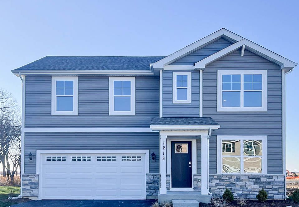Find yourself at 1218 Inkberry Lane in Hampshire, Illinois, a beautiful new home in our Prairie Ridge community. This home is ready a quick move in. This homesite includes a fully sodded yard. The Sydney plan offers over 1,600 square feet of living space with a full basement, 4 bedrooms and 2.5 baths. Coming through your front door, you walk into the open concept great room and kitchen space, making it the perfect entertaining space. Your kitchen features warm designer cabinetry with quartz countertops and a large island a barstool overhang and pantry. Walking upstairs you find your large primary bedroom with a deluxe bathroom complete with a dual quartz raised vanity and walk-in closet. Enjoy the convenience of a second floor walk-in laundry room, additional secondary bedrooms, a full second bath, and linen closet. Impressive innovative ERV furnace system and tankless water heater round out the amazing features this home has to offer! Nestled in scenic Hampshire, IL, Prairie Ridge beckons homebuyers with its promise of serene living and modern comforts. Conveniently located near major thoroughfares including I-90, Route 20, and Route 47, Prairie Ridge offers residents easy access to urban amenities while maintaining a peaceful suburban ambiance. Enjoy the sense of community in a relaxed, rural setting located near shopping, dining and outdoor recreation areas. All Chicago homes include our America's Smart Home Technology, featuring a smart video doorbell, smart Honeywell thermostat, Amazon Echo Pop, smart door lock, Deako smart light switches and more. Exterior photo of actual home. Interior photos are of similar home and model home. Actual home built may vary