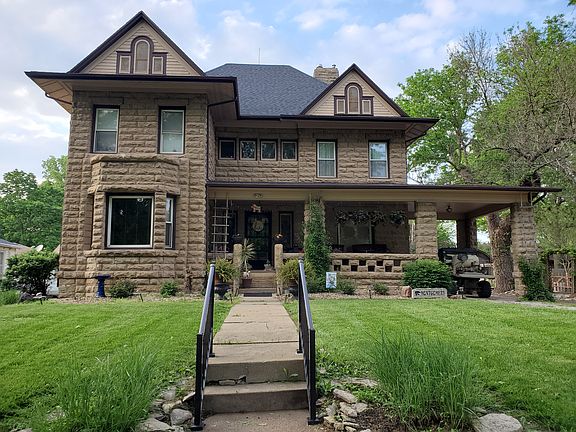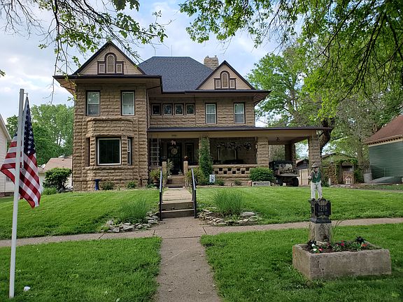 A truly unique property, this large three bedroom, three and a half bath home is a fixture of Sabetha's Main Street. It's beautiful stone exterior gives this home a curb appeal that's unmistakable. The entryway opens to a foyer with a central staircase leading up to the second floor bedrooms and bathrooms. The den provides a wonderful place for the family to relax, while the living room and dining room provide fantastic entertainment space! The home's three bedrooms are all located on the second level. The master suite has a massive bathroom with his-and-hers sinks, a walk-in closet, clawfoot tub, and multi-head rainfall shower. The remaining bedrooms share a spacious bathroom that houses one of the two laundry connections in the home. The unfinished basement has an additional full bathroom, laundry connections, and large amounts of storage space. This home's lengthy lot features a detached two car garage with an additional rented living space and two shop spaces.