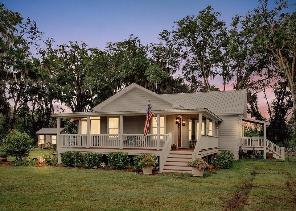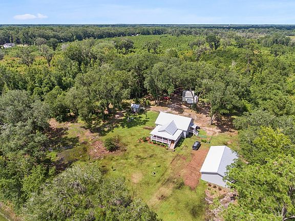 New modern farmhouse custom built 1-owner home on 4.91 private acres! Separate barn with RV & laundry hookups. Separate 3-car metal workshop w/custom bar area, insulation & new welder/compressor hookup! WAY better than a basic mancave! 2BR PLUS sunroom that could have small closet added for 3rd bedroom. Kitchen open to great room & dining area. Real wood cabinetry with auto-close drawers & cabinets in kitchen. Beautiful hardwoods thruout, NO carpet in this house! Large laundry/mud room. Upgraded tile in both baths. Master with own entryway. Enjoy your own garden, boat & RV parking, and chickens if you like! Energy efficient economical living with all new features! Great architectural roof & spray foam insulation. No water bill/private well.