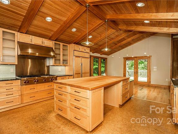 Hidden in its own quiet, lush forest, with end-of-the road privacy, this home is a rare opportunity to live immersed in natural beauty while staying connected with Skyrunner high speed internet and a whole house generator. Over 57 acres of idyllic woodland surround the carefully maintained, quality-built Craftsman-style home. The property, bounded on two sides by DuPont State Forest, is slated for protection by a conservation easement for the owner’s private use. Over a mile and a half of hand-built trails give access to the coves, streams and ridgelines of this remarkable mountain landscape. The house is open but cozy, with a gourmet kitchen featuring a central island, marble countertops and a six-burner gas Wolf range. A stone fireplace, solid wood paneling and trim, and large built-in bookcase add to the atmosphere of natural luxury. The lower level has its own living space with expansive work areas and a library that opens onto the patio and a three-tier rock waterfall feature.