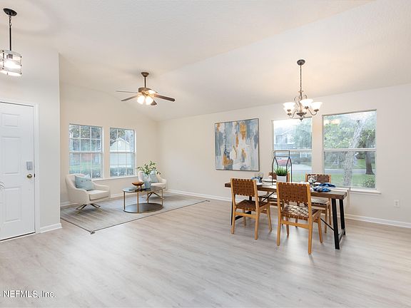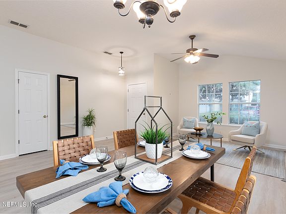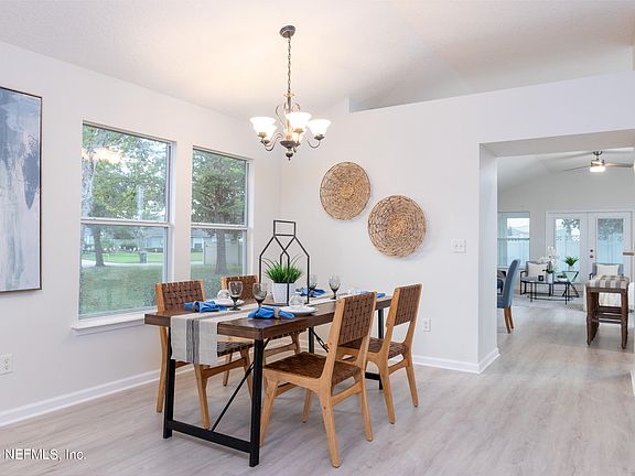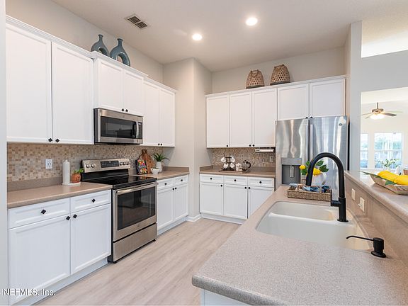 100% Financing Possible through USDA. Get into St Johns County and A-Rated schools. Do you want space and amenities? At just over a quarter acre this home has plenty of space for a pool or outdoor entertaining. This 4/2 split plan features a formal living/dining area with waterproof luxury vinyl plank flooring, volume ceilings, upgraded lighting and plenty of space for large furniture. The formal side is separated from the kitchen and family room, giving you extra space for those large get togethers. The kitchen boasts 42'' white cabinets, stainless steel appliances, decorative backsplash, dual level Corian counters, upgraded fixtures, cabinet pulls and more. French doors lead out to the covered patio, ready for your cookouts. Entering the primary suite, you will find all the space you need for that large king-sized bed, walk in closet, bathroom with garden tub, separate dual sinks, walk in shower with tile walls and decorative niche and floor. Get this one before it's gone.