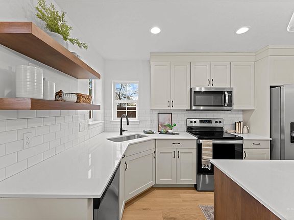 Location and low-maintenance living! Less than 2 miles from downtown & Boise State University, this 3-bed, 2.5-bath townhome offers modern comforts and timeless style. The open-concept kitchen designed for functionality and entertaining, features a spacious center island, white quartz countertops, a classic subway tile backsplash, premium Whirlpool stainless steel appliances, and grey wood-grain cabinetry. The living area flows effortlessly onto an east facing private patio & small yard - perfect for outdoor gatherings or quiet relaxation. Throughout the main level, luxury vinyl plank flooring adds a contemporary touch, while the plush carpeting provides cozy comfort in the bedrooms and upper hallway. Upstairs, are three well-appointed bedrooms, including a primary suite, separated from the other rooms by two bathrooms with double vanities for extra convenience. Detached two car garage an added bonus!