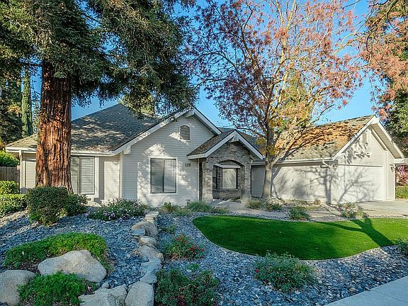 Incredibly charming Craycroft Village home in NW Fresno. Beautiful curb appeal, and well maintained single story, 4 bedroom, 2.5 bath located in a choice cul-de-sac, in a highly desirable neighborhood. You will feel the warmth and charm as you approach the double door entry. Interior features include solid wood flooring at entryway, newer carpet, ceiling fans throughout, 2- skylights, formal living & dining, newer canned LED lights and built in cabinetry. The kitchen is bright and spacious with views to the backyard. The Great room has gorgeous vaulted, tongue & groove ceiling, a lovely fireplace and hearth, natural lighting and plenty of space for friends & family to gather. The Owner's suite has a massive walk in closet, lovely bathroom with dual sinks, a walk in shower and a jacuzzi tub. Enjoy the outdoors and easy maintenance with both front and back yard having synthetic turf, mature landscaping and slated flowerbeds. This home is truly a gem!