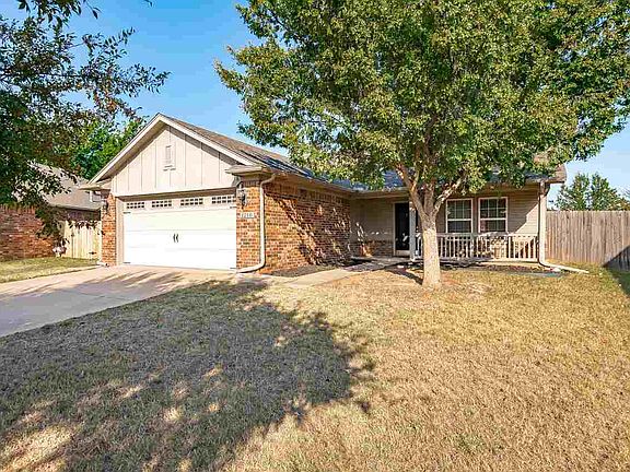 Renewed, refreshed and renovated! Located on a larger cul-de-sac lot, this home is move in ready! It is in a great location in the neighborhood and has a cozy front covered porch to enjoy. This home features an open floor plan for the living / dining and has a pass through window into the kitchen. The home has NO carpet... REAL WOOD flooring in the living area, hallways and all three bedrooms/closets. The kitchen, dining area, both baths and laundry room all have tile flooring. The primary bedroom and bath is located away from the other two bedrooms. Enjoy your evenings under a newly added covered back patio. The large back yard is fenced for your pets and privacy and no neighbors will be behind you either. The garage has new epoxy flooring and a storm shelter. The home has a security system. Some of the updated/cosmetic items include: new paint, new flooring, new faucet, new garbage disposal, new epoxy on garage floor, new covered patio added in the back, etc. All other inspections items have been repaired.