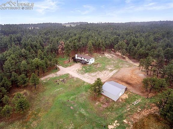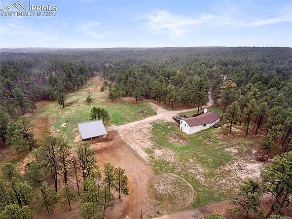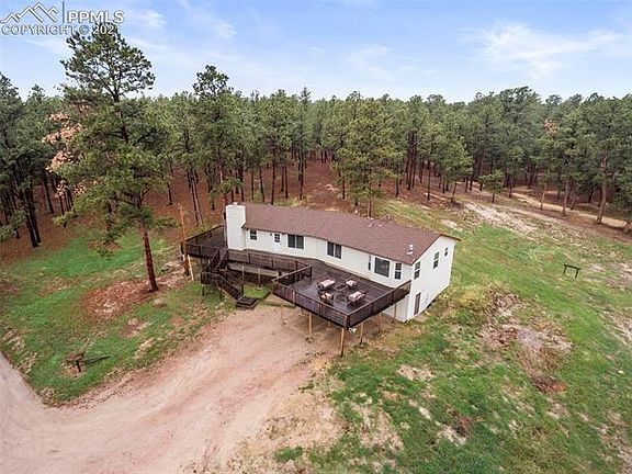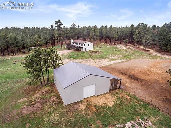 Gorgeous remodeled farm house in sought after south Black Forest at the end of a quiet cul-de-sac w/ 5.60 private acres w/ towering pines, a scenic pond, a lush green meadow perfect for horses and a 3 stall barn. The almost 1,500 sqft barn has 3 high quality stalls w/ heated auto water, a large tack room, 4" reinforced concrete floor (able to drive heavy equipment on concrete), water, electric, hay storage and two over-sized overhead doors allowing you to pull through the barn. The home is stunning and exudes farm house style. Glowing hardwood floors throughout, custom metal railings, high end sliding barn doors and tons of large windows for tons of natural lighting. The owner has meticulously remodeled this home w/ all new flooring, updated baths, new lighting, new paint, new trim and all interior doors. Guest bath w/ beautiful brick tile floors in a herringbone pattern, a custom vanity w/ vessel sink crafted by an artist, metal trough style standalone tub and shiplap. Expansive master suite w/ double doors, bay window, hardwood floors, walk-in closet and private master bath w/ double vanity and steam shower. Formal dining room w/ a wood burning fireplace and a walk-out to the side deck. Upgraded kitchen w/ stainless appliances, gas range, natural stone floors, new backsplash. Finished walk-out lower level w/ metal rustic accents, a gas stove w/ brick surround, luxury vinyl floors, huge laundry room and a fully remodeled bath w/ stylish tile, a modern vanity and hexagon tile shower floor. Amazing outdoor entertaining space w/ a huge wrap-around party size deck perfect for taking in the serene views of your acreage or watching your animals. Direct equestrian/walking trail that will give you riding or walking access to the new Pineries Open Space or Section 16 w/ miles of horse and walking trails. Oversized finished 3 car garage. Prewired for a generator. 50' concrete RV parking pad with 30AMP electric hook-up. No HOA or covenants. Zoned for horses or other animals.