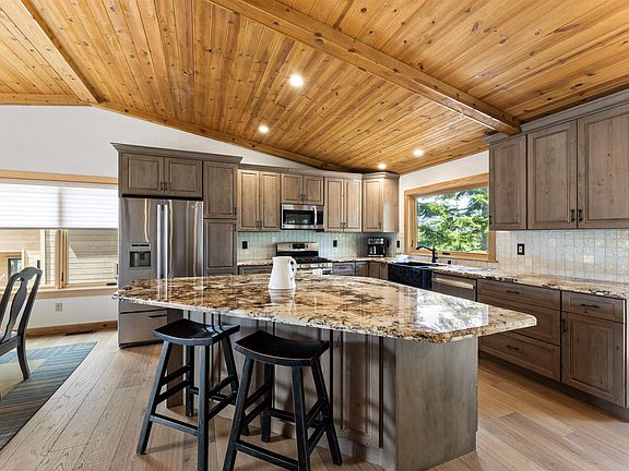 Perched high among the Tahoe mountain range in the coveted Tahoe Donner community, this home offers the perfect balance of relaxed modern living and serene natural beauty. From the moment you enter, panoramic views of Tahoe treetops and surrounding mountain ranges, create a breathtaking backdrop—like living art. The main living area features beautiful ceilings, rich hardwood floors, and an open layout designed for both cozy nights in and lively gatherings. The kitchen and upstairs bath have been remodeled with custom cabinetry, granite countertops, a granite sink, and premium finishes, adding a refined touch to the home’s warm mountain character. Upstairs, the primary suite offers a private retreat with a spacious bathroom featuring both a soaking tub and shower. Expansive picture windows frame the Tahoe landscape, turning everyday moments into peaceful escapes. An additional bedroom, laundry room, and flat driveway make the main level function like a single-level home—providing everything you need for comfortable, easy living. Downstairs extends the possibilities with a bedroom, library, media/bonus space, a second deck with hot tub, plus a huge flexible room that could serve as another bedroom, office, gym, or anything you imagine. Two inviting decks—one on each level—invite you to enjoy morning sunrises, crisp mountain air, and starry Tahoe nights. Additional upgrades include an integrated EV charging station, two-car garage, and extra parking, making year-round living effortless. Just minutes from world-class trails and skiing, yet tucked in a peaceful setting, 12185 Skislope Way is a welcoming mountain escape you may never want to leave.