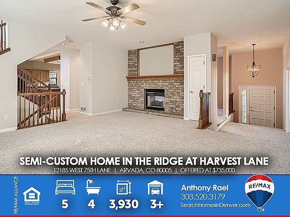 Unbelievable Opportunity in The Ridge at Harvest Lane presented by Anthony Rael, RE/MAX Alliance-DTC. . This Semi-Custom Advocate built home offers peace and tranquility on a private South-facing street with no neighbors behind. With an abundance of natural light, this home boasts nearly 4,000 square feet with 5 Bedrooms, 4 Baths + Main Floor Office/Study + Attached Workshop and an oversized 3-Car Garage. The unique floorplan offers flexibility to enter through the garage (no stairs) into an attached mechanic's dream workshop or you can easily convert the space to an in-law suite since the rough-in plumbing & egress windows are already in place. Load your groceries from the garage and send them to the kitchen via a dumbwaiter system. The main and second story features majestic mountain views from Pikes Peak to North Table Mountain. The back yard is nestled into a ridge backing to the Croke Canal with no neighbors behind and offers year-round enjoyment from the large deck, tiered moss rock retaining walls and surrounded by mature landscaping including evergreens and apple trees. Winter is just around the corner, so prepare to cozy up to the dual-sided gas log fireplace nestled between the family room and living room. The furnace and central air conditioner were replaced six months ago and also has a GAF/Elk 50-year composition shingle roof. Harvest Lane and The Ridge at Harvest Lane is a quiet and highly desirable Arvada subdivision featuring custom and semi-custom homes with breathtaking mountain views. Surrounded by popular West Arvada 80005 neighborhoods like Double-E Ranch, Saddlebrook, Alkire Estates, Village of Five Parks & Whisper Creek. This superb and relatively unknown subdivision is only 10 minutes to the boutiques, dining and brew pubs in Olde Town or a 20-minute rail line commute to Union Station or 25-minutes to Boulder + plenty of open space and trails. Drive through the community and you'll see why it's such a great place to live, work & play! Close quickly and enjoy the holidays in your new home! Have questions? 'JustCallAnts' at 303.520-3179