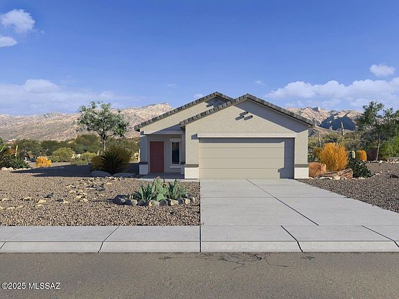 The Amber at Hanson Ridge in Vail, Arizona - a beautifully crafted 1,331 sq. ft. single-story new home that offers modern living in a peaceful desert setting.As you step through the inviting front porch, the thoughtfully designed entryway leads you into an open-concept living space that seamlessly connects the great room, dining area, and kitchen. This layout is ideal for both relaxing with family and entertaining guests. The kitchen, equipped with quartz countertops, modern appliances, and a convenient pantry, is designed to meet your culinary needs while maintaining a stylish appeal.The master suite, located at the rear of the home, offers a private retreat. Under construction