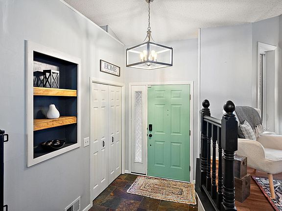 Welcome to this beautifully updated two-story home, showcasing a bright, open floor plan with vaulted ceilings and stylish farmhouse accents throughout. The gourmet eat-in kitchen features stainless steel appliances, a custom tile backsplash, granite countertops, and a butcher block center island. Luxury laminate wood flooring extends from the kitchen into the dining room and the main-floor family room. The main level also offers a convenient laundry room, a bedroom, and a ¾ bath. Upstairs, you'll find three additional bedrooms, including a spacious primary suite with a large walk-in closet. The walk-through primary bathroom boasts a jetted tub, a separate tiled shower, and a double-sink vanity. The walkout lower level includes a family room with direct access to the patio, along with two more bedrooms—one featuring an ensuite bathroom complete with an impressive tiled shower equipped with dual shower heads. Step outside to the lush, beautifully landscaped backyard, where a deck and patio create the perfect setting for relaxing or entertaining.