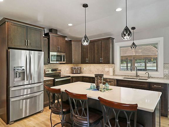 Welcome to this charming brick ranch home nestled along the picturesque Fox River. This stunning residence has undergone a complete transformation, where every detail has been reimagined from the studs out, resulting in a modern and stylish abode. As you step inside, you'll be immediately captivated by the beautifully remodeled kitchen. It boasts exquisite quartz countertops, sleek stainless steel appliances, and a convenient coffee bar/wet bar, perfect for entertaining or enjoying your morning brew. The herringbone tile backsplash adds a touch of sophistication, and with plenty of cabinet and counter space, including an island, this kitchen is a chef's delight. Adjacent to the kitchen is a welcoming dining room, providing an elegant space for everyday meals and special gatherings with family and friends. The open floor plan seamlessly connects the kitchen, dining, and living room areas, creating a spacious and inviting atmosphere. The living room is adorned with a beautiful fireplace, becoming the focal point of the room, while a wall of windows offers breathtaking views of the Fox River, allowing you to bask in the tranquility of the waterfront setting. The master suite is a true oasis, featuring an updated full bathroom and a walk-in closet, ensuring both comfort and convenience. Imagine waking up to the serene river views right from your bedroom window. Additionally, an office with a view of the river and two more well-appointed bedrooms, along with a full bathroom, provide ample space for relaxation and productivity. Stepping outside, you'll find a lovely deck with a gazebo, offering a perfect spot to unwind and appreciate the river's beauty. A boathouse with a fireplace adds a touch of luxury, providing an enchanting place to gather and enjoy the riverfront lifestyle. In the front, a spacious patio welcomes you and your guests, creating a warm and inviting entry to the home. No detail has been overlooked in the renovation, as evidenced by all-new windows and doors, a new furnace, A/C, and updated ductwork, ensuring comfort and energy efficiency throughout the home, full list of updates in additional information. In summary, this brick ranch home along the Fox River is a masterpiece of design and craftsmanship. With its breathtaking views, thoughtfully reimagined interior, and outdoor spaces perfect for relaxation and entertainment, this home offers a unique opportunity to enjoy a riverside lifestyle in a truly remarkable setting.