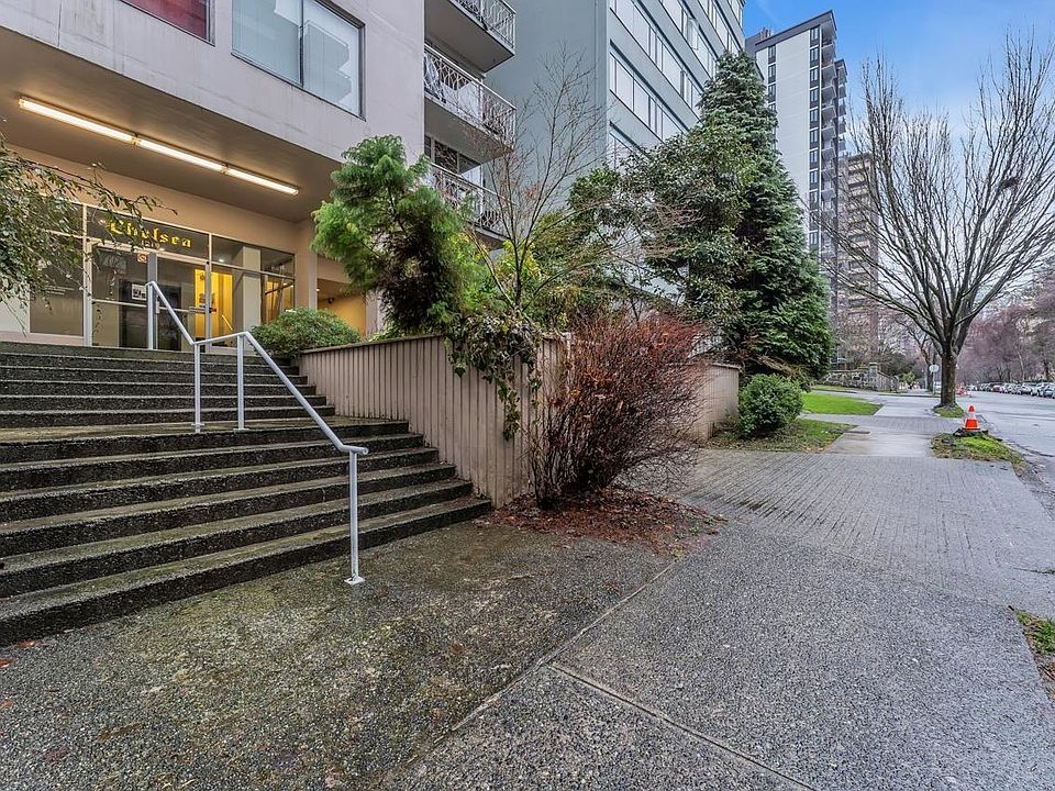 Elegant one-bedroom Northeast corner condo in the heart of downtown Vancouver's West End, beautifully renovated in the tranquil concrete mid-rise, "The Chelsea." Revel in captivating city & mountain views from the spacious balcony. Ideally located near Sunset Beach, Davie Village, Stanley Park, Denman St. This 546 sq.ft retreat features a generously proportioned living space, adorned with new carpet and fresh paint. Updated appliances and contemporary light fixtures add a modern touch. Maintenance fees cover property tax and hot water. The prepaid leasehold extends to December 31, 2073, providing long-term assurance. Indulge in urban living at its finest, seamlessly blending comfort and style in the heart of Vancouver's vibrant West End.