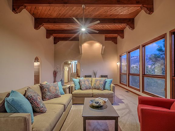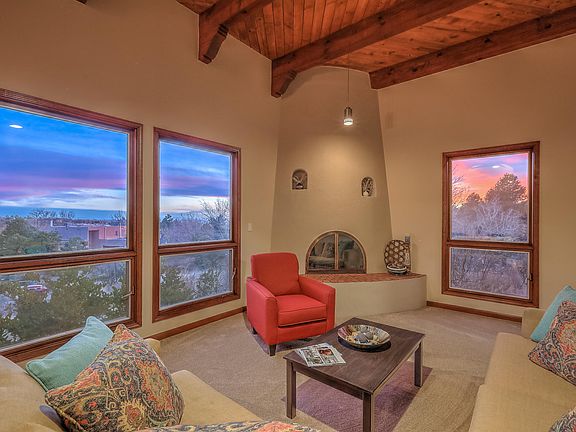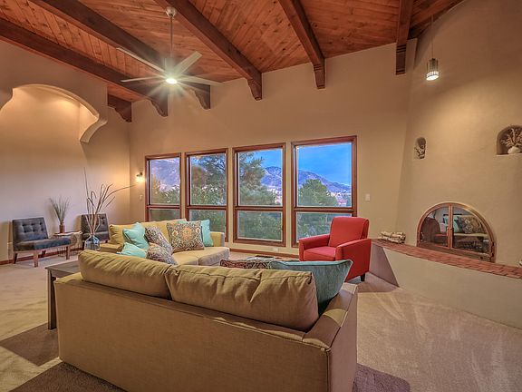 Masterfully updated Sandia Heights gem that will steal your heart. Perched on an elevation, the many large windows afford city and mountain views. Multiple skylights throughout, dramatically high-ceilinged entry & living room, solid wood custom interior doors; spacious master bedroom and bath, dramatic entry with wormy maple doors. Spacious kitchen has newer appliances and is open to the dining area and, beyond a sliding glass door, the welcoming backyard and natural chaparral. The spacious living room is characterized by a wall of south-facing windows, high beamed ceiling and traditional southwest wood burning fireplace with tiled hearth. Wildlife, including the native mule deer and passing bobcats are frequent visitors.