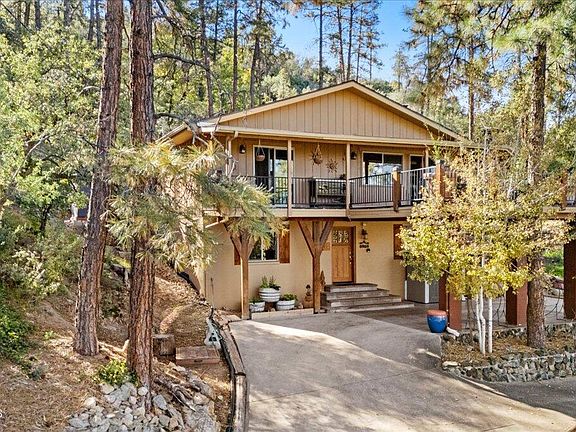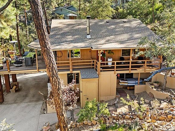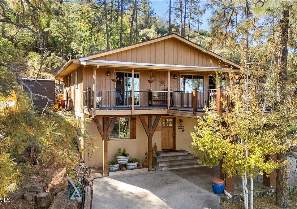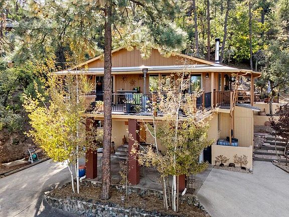 This lovely mountain home is located in the tall pines of Mountain Club Estates. Only minutes from Downtown Prescott, this home is beautifully appointed inside and out. The downstairs features a cozy family room with a wood burning stove, 2 bedrooms, a large storage room, half bath and laundry. The upstairs features hard wood flooring, vaulted ceilings, two beautifully remodeled baths, master bedroom, kitchen, dining, and living room. Kitchen features include stainless steel appliances, a NEW REFRIGERATOR, solid wood cabinetry, ample counter space. The expansive upper deck is the perfect place to take in panoramic views of Granite Mountain, Thumb Butte and Prescott's wonderful weather. The PRIVATE back yard features a beautiful flagstone patio with Gabion frame fencing. Other features include Newer vinyl windows, NEW ROOF IN OCTOBER 2025, knotty pine doors throughout. Close to shopping, hiking and biking. Located on a quiet Cul-De-Sac