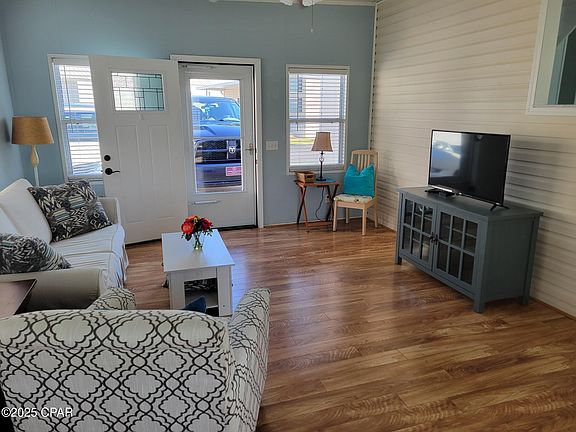 Welcome to the friendly and well-kept community of Emerald Point Resort!Just moments from the sugar-white sands of the Gulf of Mexico and some of the best restaurants in Panama City Beach, this inviting neighborhood offers the perfect blend of relaxation and convenience.This charming 2-bedroom, 2-bath beach home features a spacious living room, a well-maintained kitchen, and beautiful hardwood floors throughout. Recent upgrades include a new HVAC system and a newer metal roof. The roomy screened-in porch is ideal for enjoying your morning coffee or unwinding in the evening.Emerald Point is a gated community with fantastic amenities, including a clubhouse, two swimming pools, a hot tub, a gym, and a clubroom that hosts several monthly events. There's even a scenic boardwalk around one of the ponds, perfect for leisurely walks. Golf carts and bicycles are welcome, and the community is pet-friendly for both owners and guests. Weekly and monthly rentals are allowed, making this an excellent option for a vacation retreat or investment property.Don't miss the opportunity to experience all this home and community have to offer--schedule your private tour today! If measurements are important please measure.
