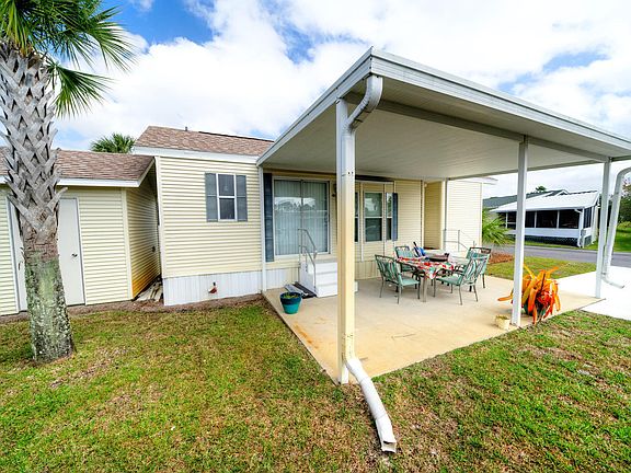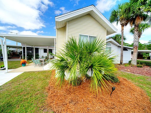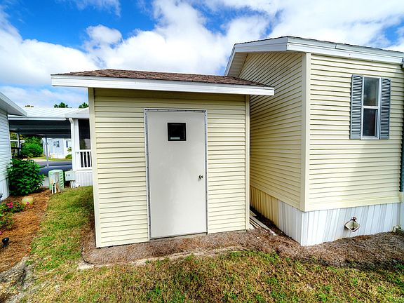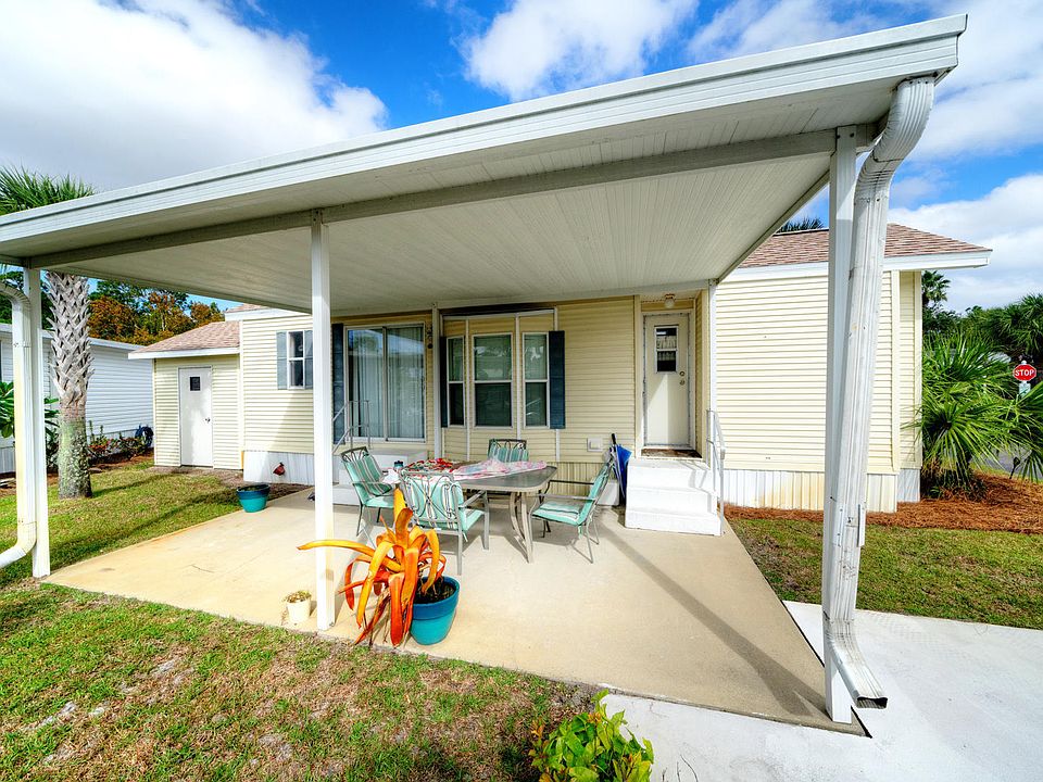 Watch the sun rise from your charming beach home located in Emerald Pointe Resort. Home features include: 2-bedrooms, 2 bathrooms, hardwood floors throughout, a spacious covered patio for your enjoyment, and a large storage building with electricity and water. The home is located on a corner lot across from the back swimming pool and it's close to the private community lake and boardwalk. The roof was replaced Dec. 2019, and the home is being sold furnished. Emerald Pointe Resort is a golf cart friendly, gated community that offers a large clubhouse, exercise room, 2 pools (one heated seasonally), hot tub, lake with boardwalk, and shuffleboard courts. HOA includes: water, sewer, garbage, cable, and lawn service. All information is approximate and should be verified by buyer if important.