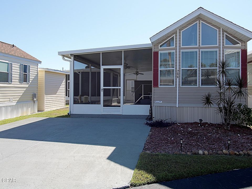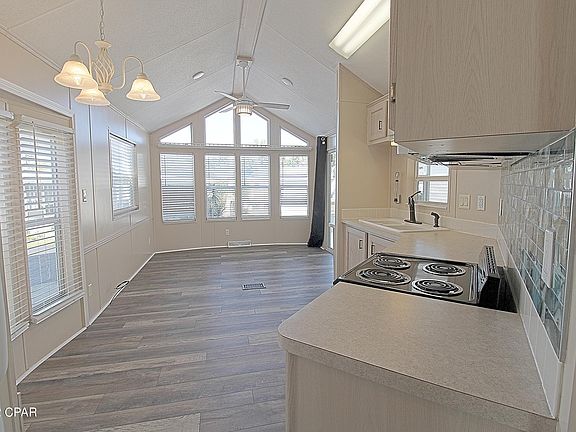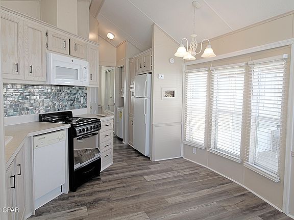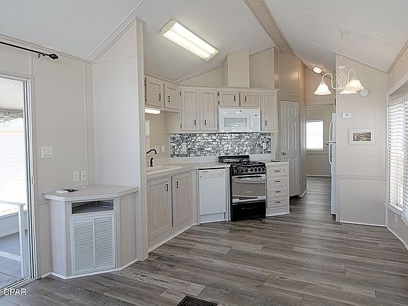 Check out this tiny home at the popular Emerald Coast Resort. This 1 bedroom 1 bath home is ready for your personal touch to furnish and decorate to your liking. New LVP floors were installed in the last year along with new blinds, stove, microwave, ceiling fan and light fixtures in the bathroom. It comes equipped with a large screened in porch with roll down solar shades for comfort and privacy. Included is a 6x8 storage shed and ample parking for 2 vehicles. Emerald Pointe Resort features two pools (one of which is heated), hot tub, playground, and shuffleboard courts. It is located in close proximity to the sugar white beaches, dining, and shopping. These single bedroom units are in high demand so book your showing today!