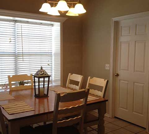 Spacious great room w/corner brick gas fireplace and wood floors. Open to the kitchen & breakfast nook, Split floor plan w/Master suite: double sinks, linen & walk in closet. Guest bedrooms w/spacious closets. Fenced yard & covered patio. Security system