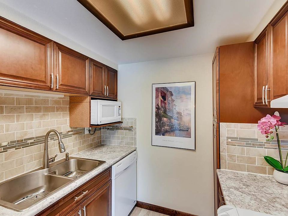Check out this great two-bedroom, top floor condo with a mountain view! Recently remodeled kitchen with custom tiled backsplash, beautiful soft close cabinets, luxury vinyl flooring, and newer appliances. Enjoy the cozy living room with solid oak custom built fireplace mantel! New huge sliding glass door leads out to your private balcony looking over the courtyard and a bit of a mountain view! Living room and dining room have newer carpet. Full bath includes new tile in shower and floor! Large bedrooms with newer windows. Great location to the new Amazon site located north on I-25. Minutes from the new Top Golf, outlet mall, and Orchard Mall. 30 minutes to downtown Denver. The facility includes an outdoor pool, playground and game room! Don't miss this one!!