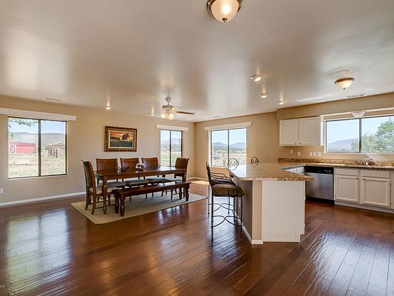 Sitting on 5 acres, with amazing Peak and panoramic views, this recently remodeled home has it all. A great, open floor plan with gorgeous kitchen with recently installed hardwood flooring. Granite countertops and a large peninsula, great for baking and cooking. Appliances were replaced in 2013. Large windows for natural light and awesome views. Roof was replaced in 2013 and furnace in 2015. Expansive deck newly maintained and painted. Landscaped sitting areas, lots of shade trees, your very own aspen grove, fish pond, fenced raised garden beds and separate dog area. Six stall barn with central aisle, water, tack area and hay storage. High quality horse fencing around perimeter 2014, cross fencing gives 3 pasture areas. Sand & cinder 50x100 riding area with 2 large sheds.