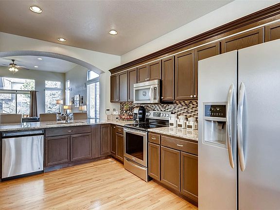 This beautiful Ranch home features a bright, open floorplan with fabulous updates making it better than new! Gorgeous hardwood floors* Remodeled Kitchen (2018) with slab granite counters* Breakfast Bar*Pantry* Stainless Steel Appliances* Dining Room with Bay Windows, Plantation Shutters and a Ceiling Fan* Master Ensuite (Remodeled 2018) with 5-piece bath, soaker tub, walk-in closet with custom built-in shelving*Family Room with gas fireplace*recessed lighting*ceiling fan*Newly remodeled (2018) Outdoor living space with Stamped Concrete Patio and fenced corner lot. Main floor Laundry Room with Custom Cabinets and a niche for storage. Every bedroom has a ceiling fan* Full unfinished Basement* Radon mitigation system* Water conditioner*central air*security system* Two car attached garage. Easy access to I-76 and E-470 and the brand new Bison Ridge Recreation Center. This home has it all!