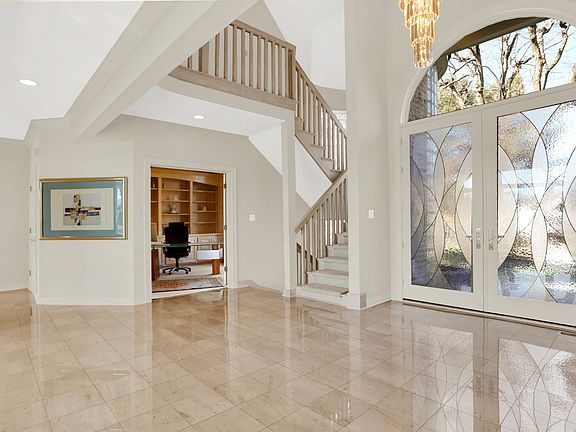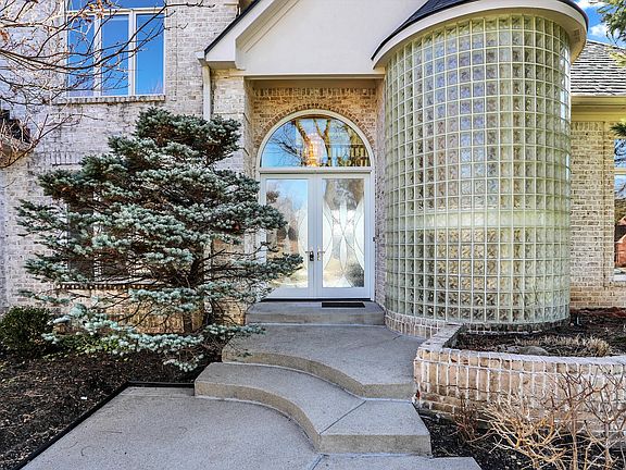 This gracefully constructed and meticulously maintained residence exudes elegance, situated on a picturesque lot boasting captivating water vistas from nearly every vantage point. Upon entry, a soaring ceiling in the foyer sets the tone, leading to the breathtaking great room adorned with a coffered ceiling and expansive windows that frame the scenic views. The formal dining area, seamlessly integrated yet discretely positioned, flows into a gourmet kitchen featuring a central island, circular dining enclave, and adjacent family room accentuated by lofty tray ceilings. Equipped with top-tier KitchenAid appliances, the kitchen also offers dual walk-in pantries for added convenience. An inviting study or office, characterized by its lofty ceilings and generous windows overlooking the verdant yard, provides a tranquil workspace. The main level master suite, distinguished by tray ceilings, encompasses a spacious en-suite bathroom with a luxurious Jacuzzi, double vanities, and a standalone shower, complemented by a generously sized walk-in closet. Ascending the glass-enclosed winding staircase reveals a versatile space that can serve as a prayer room or additional storage. The upper level accommodates three bedrooms, each with access to a full bathroom, while one bedroom boasts a charming balcony. The walkout basement is an entertainer's delight, featuring a circular wet bar within a vast recreational area devoid of pillars, capable of hosting gatherings for 80 guests or more. Additionally, a fifth bedroom with an adjoining full bath and walk-in closet provides comfort and privacy. Further enhancing the property's allure is an indoor hot tub within the gym area, alongside utility spaces and ample storage options. Completing the residence is a three-car garage with integrated storage solutions. Outside, the property showcases its natural beauty with scenic water views, a spacious deck, and other amenities, offering a truly enchanting retreat.