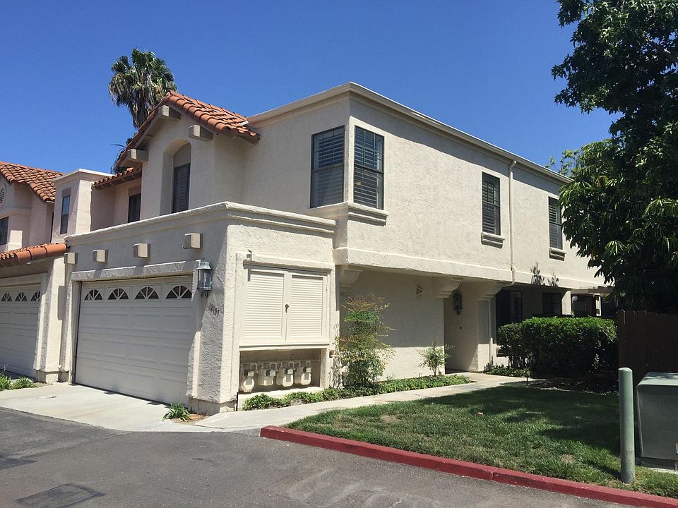Largest floorplan at highly desirable Sunstream with master and 2 more bedrooms all upstairs, master bath & 2nd bath upstairs, and 1/2 bath downstairs. Open vaulted ceiling to second floor with fireplace. ~5 yr old new WPC flooring (modern grayish brown) throughout except for tile in kitchen & baths and carpet in non-master bedrooms (sorry - some pics still show old wood flooring color). Carpet in non-master bedrooms replaced at same time. Economical ceiling fans throughout plus A/C and heat. End-unit provides lots of sunshine and great size wrap-around backyard with 2 patio areas, small grass patch, roses, and planted areas - feels like a detached unit. Front door opens out to HOA maintained grassy area. Convenient attached 2-car garage with W/D - plus parking and guest parking permits. Brand new refrigerator. Quiet Sunstream community features 2 tennis courts, 2 pools with bbqs, fitness center, clubhouse, and great neighbors. Water, sewer, and trash included. Perfect location in coveted Carmel Valley! Great school district for all ages . Minutes away from CA-56 and I-5 for easy central access to all of SD county. Quick access to Torrey Pines and Del Mar beaches. Sunstream sits just above the Von's Valley Center shopping and accross the street from Carmel Grove park with a new playground. Short, easy pathway walk to exciting Del Mar Highlands shopping center and One Paseo development with many new dining and shopping options. Great school district: - Carmel Del Mar Elementary - Carmel Valley Middle School - Torrey Pines High School $4200 per month with 12 month lease, 1 month security deposit, application, and credit approval. Non-smoking only. Dogs / pets by approval only. Currently occupied by tenant until late/end September - might have some move-in timing flexibility if interested. Property is available only by scheduled tour at this time. DO NOT disturb current tenant. If interested in the open house, please send occupant information including number of occupants with ages, household income, pets, number of cars, and desired move-in date window. standard