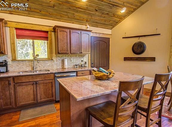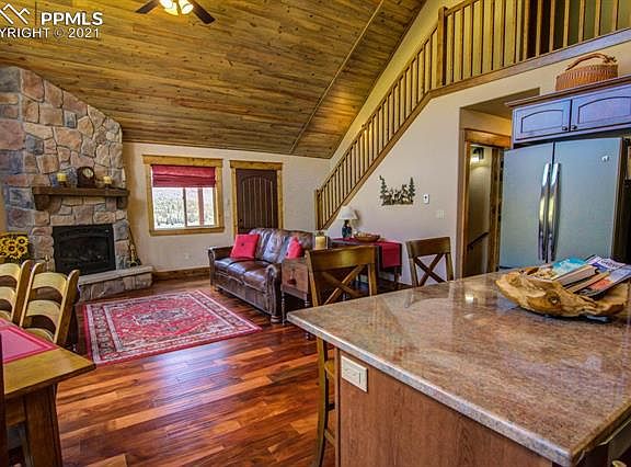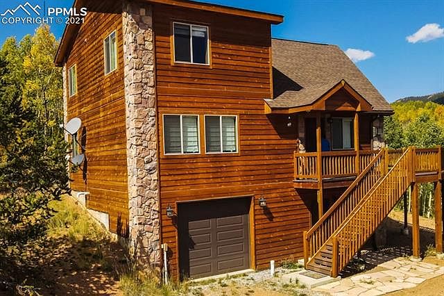 Fantastic home surrounded by beautiful aspens! 9.55 acres with great mountain views. Easy access off Hwy 67, minutes to Cripple Creek, and close to everything. Open concept with vaulted ceilings, and the living room has a majestic faux stone gas fireplace. Engineered hardwood floors on the main and loft levels, and unique stained and scored-to-look-like-tile concrete floors on lower level. Tongue and groove wood ceilings, and the kitchen has granite countertops with all appliances included. A convenient extra large wine fridge is located in the kitchen island. All furniture is included for a turnkey home, including leather sofas, bunk bed in lower level, 3 queen beds with 2 new mattresses purchased in 2015, 2 travertine tile bistro height deck tables with 8 chairs & cushions, Weber propane grill, and the furniture in kitchen, loft, and lower levels are all new. Other features include radiant floor heat, custom cloth blinds on main and upper levels, wood blinds on lower level, solid wood doors, stackable washer/dryer, and an oversized 1 car garage. From the main level, walk out to a wrap around deck with low maintenance Trex, and enjoy the incredible views of Sentinel Point and Pikes Peak! This home would also make a great VRBO!
