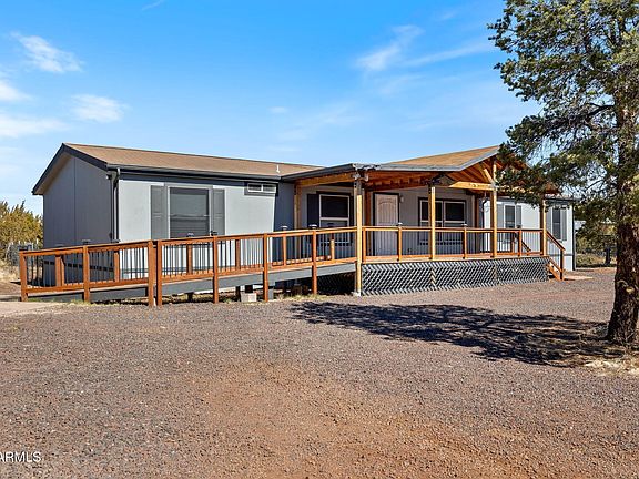 This beautiful manufactured home, located just outside of Show Low in the peaceful community of Vernon, Arizona, is a must-see! Situated on a fully fenced, flat 1-acre lot with an electronic gate, this property offers both privacy and convenience, with town just minutes away. Boasting over 1,900 square feet of living space, the home features a well-designed split floor plan with three spacious bedrooms, two bathrooms, and a versatile flex room that could easily serve as a fourth bedroom, office, or hobby space. The home is beautifully upgraded throughout, including stunning luxury vinyl flooring that adds a touch of elegance to every room. The gourmet kitchen is a standout with ample cabinetry, great storage, and plenty of counter space, making it a perfect spot for preparing meals or entertaining guests. The master suite is a serene retreat, offering plenty of space along with a luxurious bathroom featuring a separate tub and shower, double vanities, and a generous walk-in closet. A spacious detached garage provides additional storage and workspace, while the covered front deck offers a perfect spot to relax and enjoy the peaceful surroundings. With the home freshly painted inside and out, this property truly shines and offers incredible value for the money. Whether you're looking for a tranquil getaway or a full-time residence, this Vernon home has everything you need!