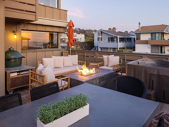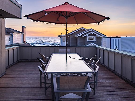 Vacation at the beach in Del Mar where the surf meets the turf. This home has 4 bedrooms plus a 5th optional bedroom. Private master retreat with white water views and an expansive roof deck. Situated on a corner lot, there are fabulous sand and white water views from most rooms. Wake up to the sound of the ocean waves in this open flowing floor plan with so many amenities, including a private rooftop deck for lounging and watching sunsets, fully stocked kitchen with high end appliances for any chef. The second level deck has incredible views and allows an indoor /outdoor flow with dining table, fire place BBQ and hot tub. There are 8 parking spots all behind electric gates, an outdoor shower after a day at the beach, a large laundry room with two full sized washers and dryers and the garage is full of bikes and surfboards.