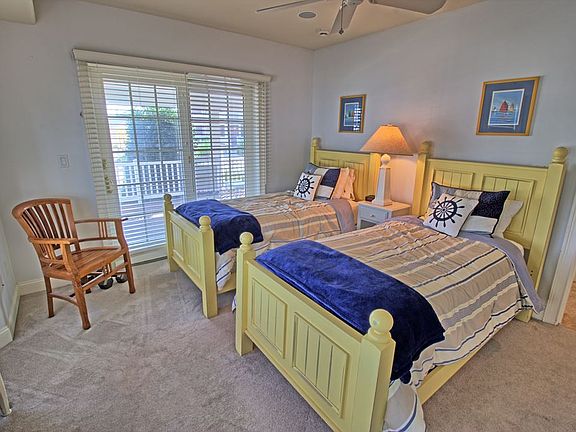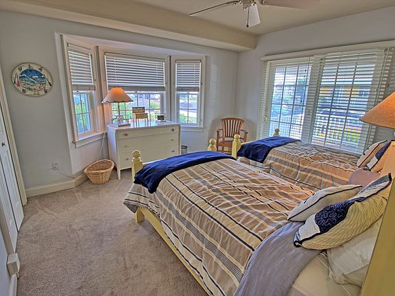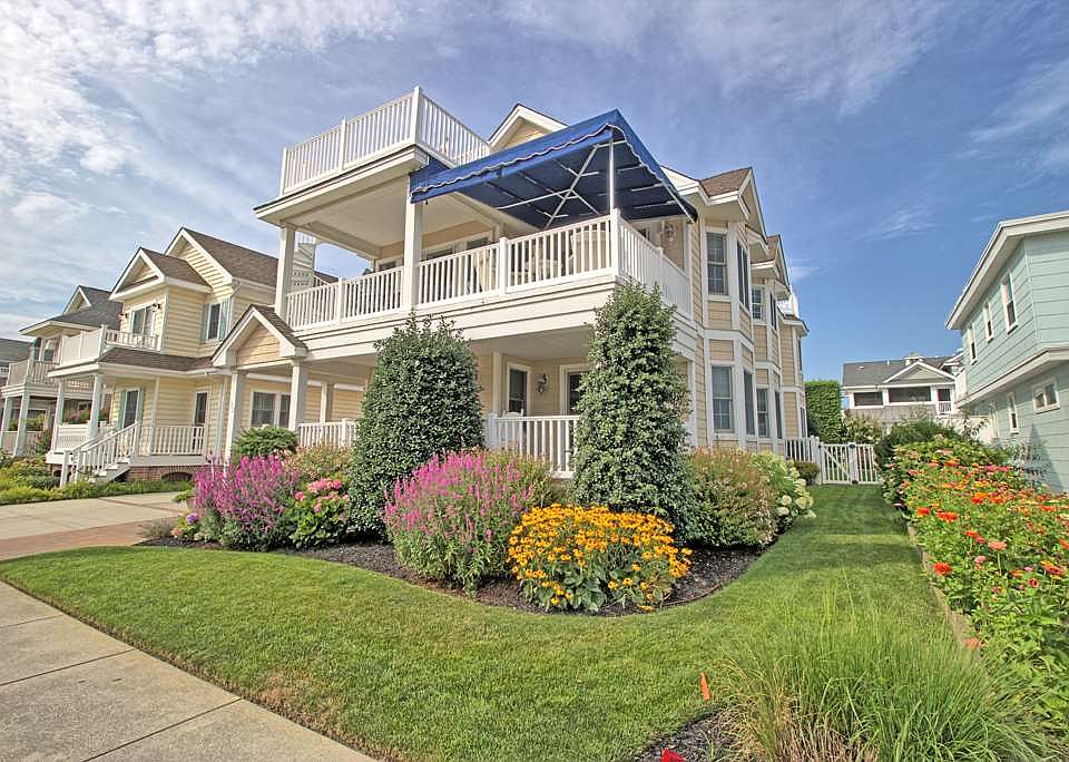 Almost Beachblock! Beautiful upside-down home providing all of the sizzle of a beachblock location without the premium price! Located on the second lot west of First Avenue, the home was expertly designed to capture every possible ocean view and they succeeded. The second floor great room has volume ceilings, granite kitchen with counter bar, living room with fireplace and large dining area all flowing to the main southern exposed sundeck with new awning and new powdered coated spiral staircase to an upper level deck. The ocean and sunset views from these decks are simply outrageous. The great room has a dramatic staircase to another upper level deck with a coastline view of waves crashing on the beach. First floor has a covered porch, bright entry, three bedrooms, two baths, laundry room and a spacious family room with custom cherry cabinets leading to a comfortable screened-in porch overlooking the rear yard and future pool if desired. The second floor master bedroom is vaulted, features a beautiful ensuite master bath and spacious, private rear deck overlooking the yard. The location, in addition to being steps to the beach, is also walking distance to restaurants, entertainment, town, tennis courts, playground, basketball courts and ball-field. The upper decks are the most fabulous place to watch Fourth of July fireworks! Other features include tiled entry, maple floors and staircases, powder room servicing the great room, full garage, ample off-street parking, sensational landscaping and a gorgeous evergreen landscaped privacy screen in the rear yard. The home is sold fully furnished.