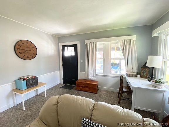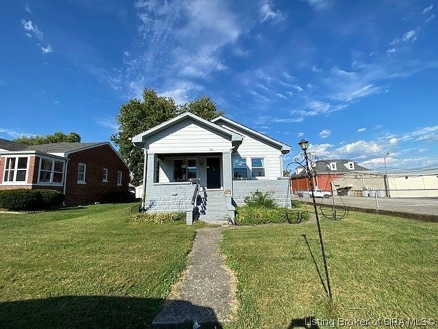 CHARMING BUNGALOW in downtown SELLERSBURG near restaurants, shops, and the expressways! This well taken care of 2BR 1 BA home features a large living room with a DECORATIVE FIREPLACE and windows that showcase natural light. The Dining Room has BUILT-IN shelving. The house features a full basement which allows for ample storage space. Property also includes a 2 CAR DETACHED GARAGE! Enjoy relaxing outdoors on the covered front porch! Recent updates include: new kitchen tile backsplash and cabinets (2022), replacement thermopane windows (2016), carpet throughout living and bedroom areas (2016), and kitchen and dining vinyl plank flooring (2022). Call for a private showing today because this one won't last long. Sq ft & rm sz approximate and should be verified by buyer if important.