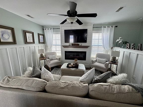 This recently updated home features fresh paint, shiplap, board and batten accent walls, a new bathroom vanity, modern light fixtures, ceiling fans, a Touchstone fireplace, upgraded faucets, and more.