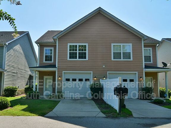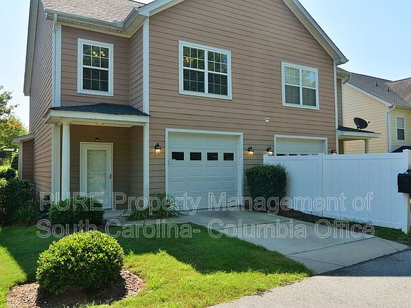Charming 3 bedroom, 2.5 bath townhome in the Woodleigh Park neighborhood of Lake Carolina in NE Columbia. Covered front porch and rear entry 1-car garage. Open floorplan main living area with crown molding throughout downstairs. Living room has a ceiling fan and gas log fireplace and is open to the dining area with bar counter. Kitchen features tile flooring, backsplash, and included white smooth-top stove, built-in microwave, dishwasher, and side-by-side refrigerator. Mudroom area off back entry near garage. Master suite upstairs has a walk-in closet and full bathroom with double vanities and garden tub/shower. Two additional bedrooms and 2nd full bath with tile floors off the upstairs hall. All bedrooms have ceiling fans and there is a half bath downstairs. Neighborhood has its own playground. Convenient to 1-20 & I-77, Sandhills shopping/dining, and Richland 2 Schools.