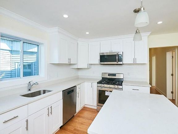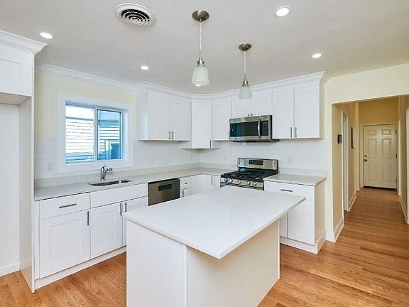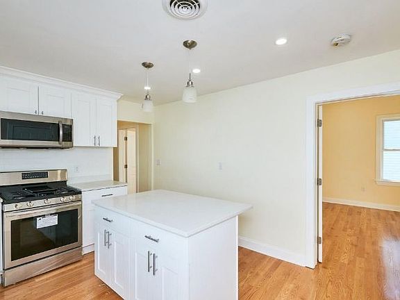 TOP OF THE HILL LIVING! Brand new large 1375 sq ft three bed, one den top floor unit! Has its own exclusive entrance with foyer! All new finishes with red oak hardwood floors, assigned parking, digital thermostat for Navien HYDRO AIR HVAC system, Video Door Entry System, Top of line brand new appliances, Kitchen Island, unit laundry hookups. Unit has rear porch. Located between Bellingham Sq (bus stop for 4 MBTA lines) and Silver Line stop.