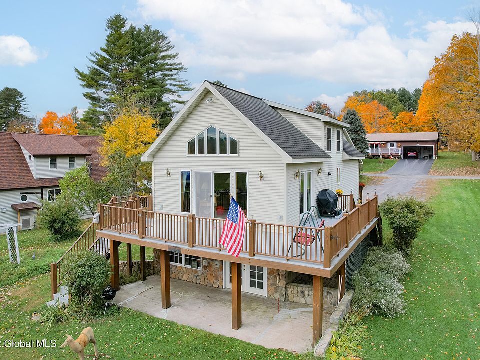 With 80' of waterfront on the Great Sacandaga Lake, welcome home to year round lake living! Walk right out to the water's edge from the front lawn of your three level home and pull your boat up to your dock to begin making memories. The home's main level with solid hardwood floors features an open floor plan and opens up to a composite wrap-around deck for relaxing and entertaining. Upstairs, the second floor loft with a bedroom and a half bathroom also gives lake views. The lower level walk-out is the perfect setup for a future in-law suite or Airbnb, and as a bonus there's also an oversized detached garage with tons of second floor storage! This home's layout w/ approximately 2400 sf living area and 80' of direct waterfront, will make it your perfect Lake Home!