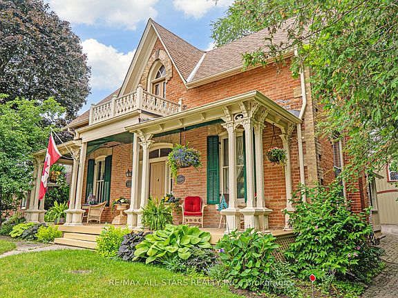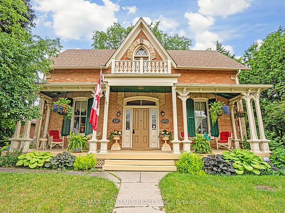 Step into timeless charm at 122 Brock St E, a captivating 2,366 SqFt 1.5-storey century home steeped in Uxbridge history and lovingly maintained over the decades. Known as the 'Robert Mooney Residence' (c.1874), this one-of-a-kind property offers rich character, craftsmanship, and a lifestyle full of warmth and authenticity. Set on a mature, treed lot in the heart of town, the home welcomes you with a lovely front verandah, and upper balcony restored in 2022 with custom millwork, plus ornate period-style wrought iron fencing and gate which compliments the home's heritage aesthetic. A standout feature is the Garage (2013) approx. 40' x 24' with 19' cathedral ceilings, designed to compliment the period of the home with reclaimed doors, stained glass windows, and vintage hardware - it also showcases soffit lighting, a propane heater, 60-amp panel, 3-pc bath rough-in; An incredibly versatile space for a workshop, studio or storage area for cars or a boat. Inside the home you'll find the open-concept kitchen featuring a breakfast area and KitchenAid stainless steel appliances (2019), flowing into a charming sunroom ideal for your morning coffee. Formal living and dining rooms offer large windows and original trim, preserving the home's historic soul. Upstairs, the spacious primary bedroom features a 3-piece ensuite and two closets, including a walk-in. Two additional bedrooms plus a 4-piece bath with clawfoot tub, double sinks, and california shutters. Upper-level laundry includes washer, gas dryer, and laundry sink. The backyard is a quiet retreat with a very private back deck and covered side porch with access to exterior storage, perfect for tools or seasonal décor. This home is perfect for buyers who appreciate heritage, quality, and character - all just steps to shops, dining, and trails!