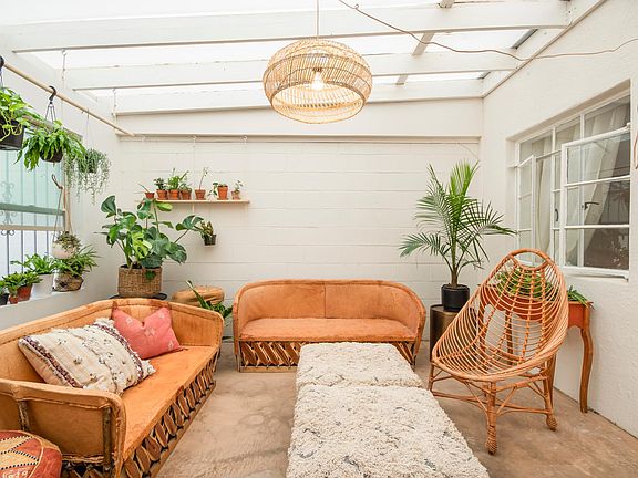 The interior space is filled with original mid century modern furniture and rugs and tapestries from Morocco. The main bedroom has a window and a door that leads into a plant filled solarium. The queen bedroom has a fireplace with a cozy lounge area. And finally the smallest bedroom has a queen bed.