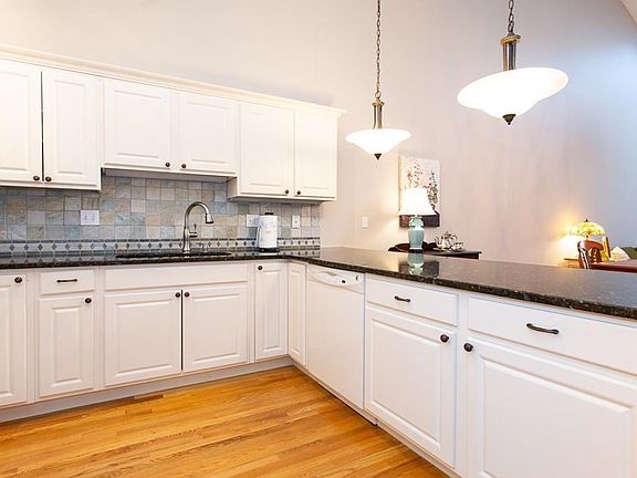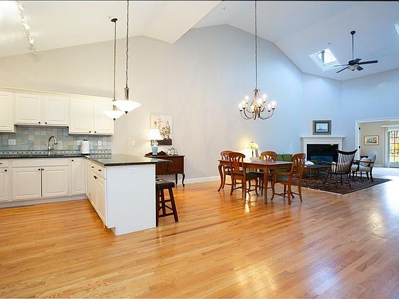 BEAUTIFUL unit in sought after, over 55 Canterbury Woods offers privacy with abutting woods, convenient one floor living, loads of light, open plan & plenty of living space featuring vaulted ceilings w/skylights & hardwood flooring. Kitchen highlights white cabinetry w/crown molding, granite countertops, tiled backsplash & breakfast bar providing seating for four. Expansive great room/dining room features gas fireplace w/granite surround & white painted wood mantel leading to cozy den through double French doors. Den has carpeting, ceiling fan & slider providing access to patio for optimal outdoor enjoyment. Master suite has tray ceiling w/crown molding & ceiling fan, two walk in closets w/shelving & large bath w/tile flooring, huge vanity & fiberglass shower w/glass sliding doors. Front bedroom features hardwood floors, walk in closet & ensuite full bath w/adjacent laundry room. Lower level offers plenty of storage & future finished living space.Two car attached garage is added bonus.