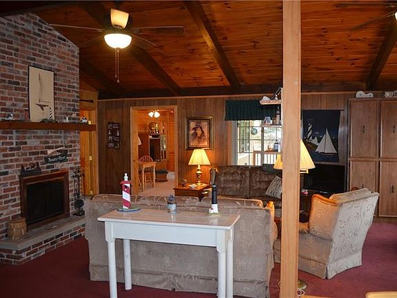 This terrific park lot home is very well maintained with open living area, vaulted ceiling, fireplace, covered porch with a very nice lake view. The recent family room addition includes 2 of the 4 bedrooms and all finished in knotty pine--this area opens to an enclosed 8x24 foot deck with lake view. Some of many amenities include R36 insulation in ceiling, thermal pane windows throughout, two detached garages. A paved path leads to the water & the 25' of lakefrontage complete with covered dock, electric lift, patio area with fire ring, picnic table. This is a great property with one of the best lake locations!