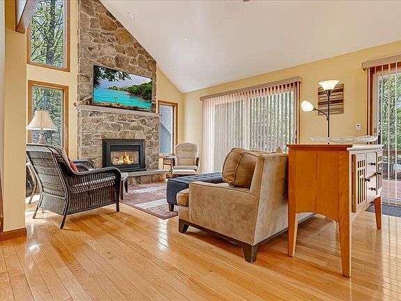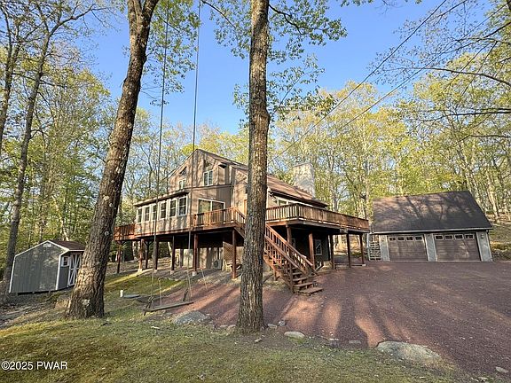 Well-Kept Contemporary Chalet - Your Private Spa Retreat in Tanglwood Lakes (Comes Furnished!)Beautifully maintained and thoughtfully designed, this 4-bedroom, 3-bath contemporary chalet is serenely situated in the highly sought-after Tanglwood Lakes community. Whether you're looking for a peaceful full-time residence or the ultimate vacation escape, this home offers a seamless blend of modern comfort, natural beauty, and resort-style amenities. Just a short golf cart ride from the fairways of the 18-hole PGA Fazio-designed golf course or the community's private access to Lake Wallenpaupack, you'll enjoy the perfect mix of recreation and relaxation.Step inside to discover an open floor plan highlighted by soaring cathedral ceilings and a dramatic two-story stone fireplace--the stunning focal point of the living room. Oversized windows frame views of the surrounding woods, creating a tranquil, light-filled atmosphere throughout. A heated Florida room and airy open loft offer flexible spaces to unwind or entertain. The modern kitchen features granite countertops, updated appliances, and custom touches designed for both style and functionality. New energy-efficient ductless A/C units and ceiling fans provide comfort in warmer months, while a propane fireplace and cozy wood-burning stove keep the home warm all winter long. The finished lower level expands your living space with a spacious family room--perfect for movie nights or game day gatherings. Outside, two expansive decks extend your living space even further. One includes a built-in hot tub, ideal for stargazing or soaking after a long day. The front sun deck is especially impressive with its generous size, ideal for multiple seating areas, games, or simply soaking up the sun. A detached two-car garage adds further versatility, featuring a large upper level ready to be transformed into a game room, art studio, or private office. Don't miss this rare opportunity to own a move-in ready sanctuary!
