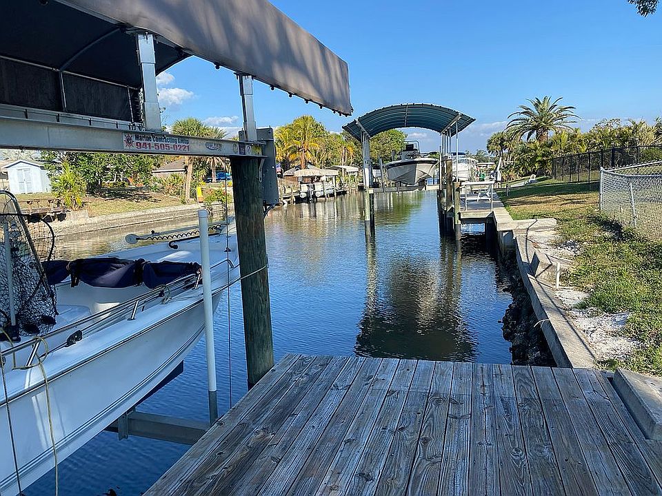 PEACEFUL WATERFRONT/CANAL LIVING right off the Elkcam Waterway into Charlotte Harbor & the Gulf, Peace River, Myakka River & Alligator Bay for great fishing and/or just enjoying the tropical waters! SOLID block/concrete home which has survived ALL of the hurricanes w/ no flooding or other house damage & NOW has brand new quality roof, updated hurricane windows, heat/ac unit, water heater, electric panel & much more! Quaint 2/2 ranch style home w/ att 1-car garage, FENCED-IN yard w/ privacy panels on both sides, screened in lanai plus a covered outside patio area & extra fenced in parking area for trailers or whatever. Canal decking recently renovated, water & electric to the waters edge for boat lifts/power washing/etc.. 80' DIRECT WATERFRONT -LOCATED ON FULL ACCESS CANAL ON CHARLOTTE HARBOR SIDE OF HWY 41 for enjoying great fishing & water enjoyment in Peace River, the Harbor & out into the Gulf if you so choose - and some of the best fishing in & out of the mangroves! Updated dock AND a newer electric boatlift! Fenced yard for kids/dogs w/partial privacy fence both sides, screened in lanai & addt'l covered patio area as well. Approx 920 +/- sq ft total not including the lanai. Shd qualify for most financing. Selling because owner getting too old to maintain 2+ homes. FOR SALE & NOT FOR RENT. Potentially can be sold partly to mostly furnished!! Note: One of owners has real estate license. OCCUPIED/BY APPT ONLY! INFORMATION IS DEEMED ACCURATE BUT NOT GUARANTEED. THE BUYER/BUYERS AGENT TO VERIFY ALL ASPECTS OF THE PROPERTY TO BUYERS SATISFACTION DURING INSPECTION PERIOD.