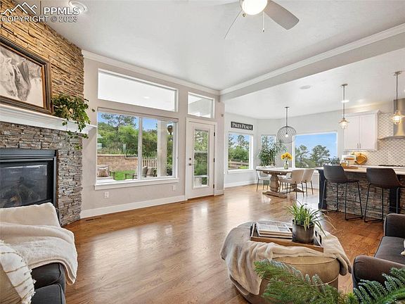 Welcome in to this impeccably maintained & stylish home in Northgate, where every corner has been well thought out. Built by award winning custom home builder, Hammer Homes. With 4 bedrooms, 4 baths, covered patio and more, you'll experience all the comforts you'd expect. From the minute you walk through the front door into the main level living space, you'll see what makes it so special. Warm hardwood floors, high ceilings & hand troweled walls provide elegant upgrades on top of all the features that offer convenience. Enjoy the gas fireplace or step out year round to enjoy the covered patio. The kitchen, with stainless appliances, 42" cabinetry, gourmet island with stacked stone façade, glassed door pantry and plenty of well lit prep space, naturally becomes the heart of the home. The open floorplan keeps even the busiest home chef engaged in the surrounding activity. Step into the main level primary suite to enjoy the privacy & the views. Also on the main level, a second bedroom with double closet, easy access to the laundry room and heated 3 car garage. Downstairs, find plenty of room to entertain or create your own private movie theater. Gather around the 2nd fireplace or walk up to the wet bar and grab a cold beverage from the convenient drink fridge. A junior suite with private full bath, a second bedroom & full bath round out the spacious, fully finished basement. Downstairs rooms have crisp white plantation shutters, plush carpeting and walk in closets. Under stair storage is discreetly tucked away but readily accessible. Also worth noting is a downstairs utility room with storage and a 2nd Washer hookup. This home, in the heart of Northgate, is conveniently located near all the north end offers - including D-20 schools. Quick access to I-25 for north or south commutes, shops, restaurants, parks, hiking and more.